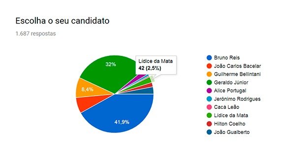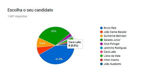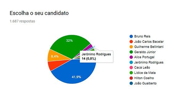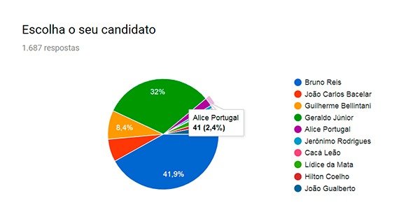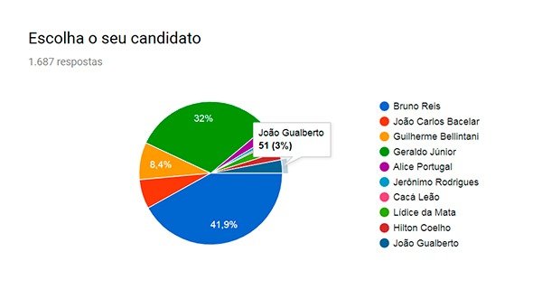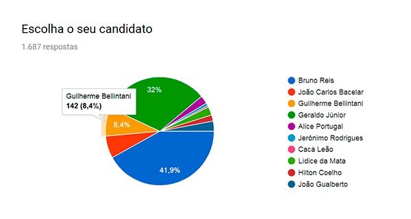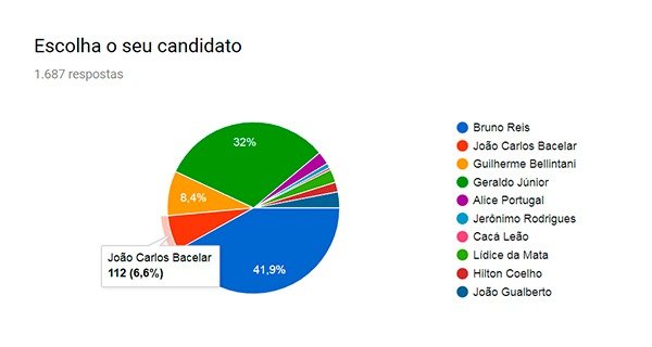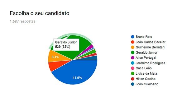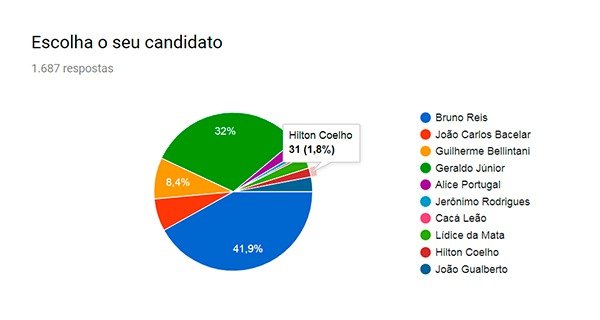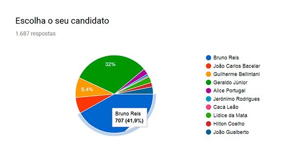 Bruno Reis liderou a pesquisa com 707 votos 41,9% do total), seguido, bem de perto, pelo atual presidente da Câmara Municipal, vereador Geraldo Júnior com 539 votos (32%).