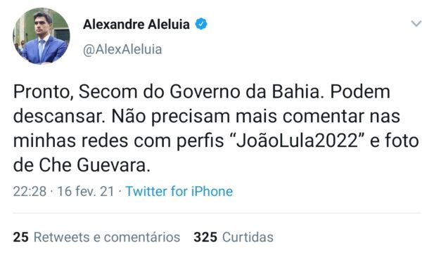 Único agente político de direita com mandato, Aleluia tece duras críticas à gestão do petista Rui (veja prints abaixo). Com uma estrutura minúscula, Aleluia “monopoliza” as críticas ao Governoda Bahia.