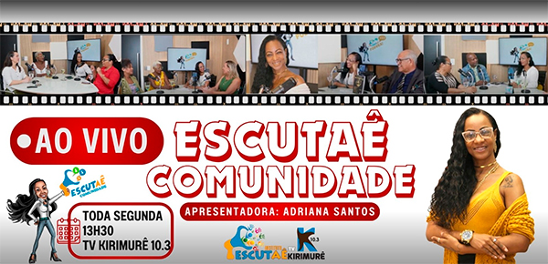 O programa Escutaê Comunidade, transmitido ao vivo todas as segundas-feiras, às 13h30, pela TV Kirimurê canal 10.3, tem se consolidado como um importante espaço de valorização das vozes e talentos das periferias de Salvador e região metropolitana. Idealizado e apresentado pela jornalista, produtora cultural e ativista Adriana Santos, o projeto é reconhecido por sua abordagem afetiva e engajada, centrada na comunicação popular e na promoção da cultura viva das comunidades.
