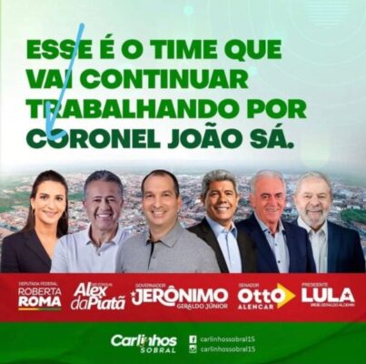 Horas depois do tal acordo, a figura da candidata Roberta Roma aparece num “card” junto ao ex-presidiário Lula da Silva, Otto Alencar e dois candidatos baianos de extrema-esquerda.