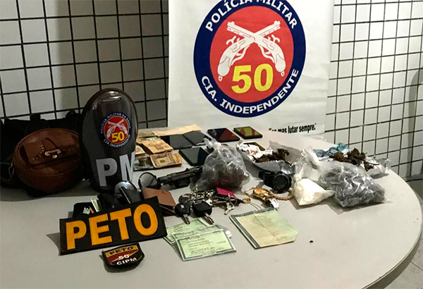 Foram apreendidos com os criminosos R$ 3 mil, um revólver calibre 32, 72 porções grandes de maconha, 21 embalagens de cocaína, uma folha de cheque, um dólar e sete aparelhos celulares. Autuados em flagrante por roubo, porte ilegal de arma e tráfico de entorpecentes, os criminosos foram encaminhados para a Central de Flagrantes.