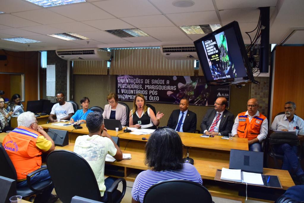 Uma audiência pública realizada nesta terça-feira (19) na Assembleia legislativa da Bahia discutiu sobre o impacto do vazamento de óleo na saúde de pescadores, marisqueiras e voluntários. Proponente da audiência, a deputada Fabíola Mansur (PSB) explica que o objetivo foi prestar orientações para os grupos populacionais que estão mais expostos aos riscos de contaminação, seja pela inalação, pelo contato com a pele ou pela ingestão de alimentos contaminados. O ato reuniu pescadores, marisqueiras e diversos órgãos do Estado. A audiência foi realizada conjuntamente por três comissões temáticas: Educação, Cultura, Ciência, Tecnologia e Serviços Públicos; Saúde e Saneamento; e Direitos Humanos.