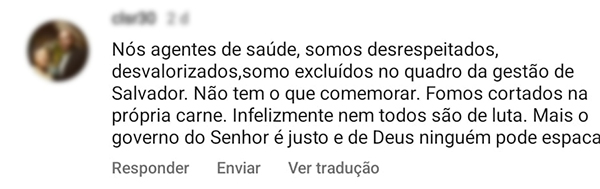 Em redes sociais, os agentes de saúde e endemias de Salvador mostraram todo o seu descontento pelo circo armado por meia dúzia de pelegos à mando de partidos de exterma-esquerda de Salvador subordinados ao petista Rui Costa.