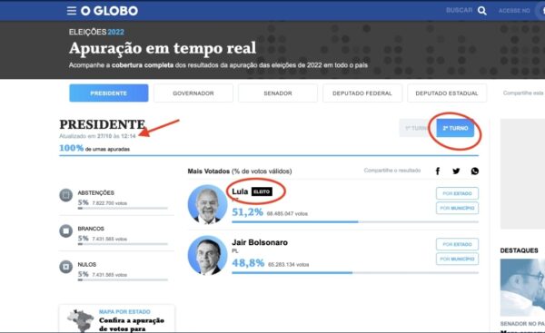 O portal de notícias O GLOBO publicou nesta quinta-feira (27) o resultado do pleito eleitoral 3 dias antes.