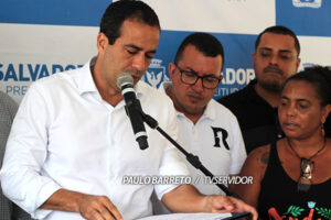 O prefeito Bruno Reis, ao lado do titular da Secretaria Municipal de Ordem Pública (Semop), Alessandro Lordello, assinou nesta terça-feira (8) a ordem de serviço para a construção de um camelódromo, localizado na Rua Plínio Garcês de Sena – Rótula do Setor C.