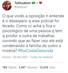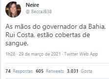 Minutos depois da execução do Soldado Wesley Soares no Farol da Barra, internautas subiram a hastag “Rui Costa Genocida” em redes sociais. Em Twitter, o termo está entre os 10 assuntos mais comentados no mundo.