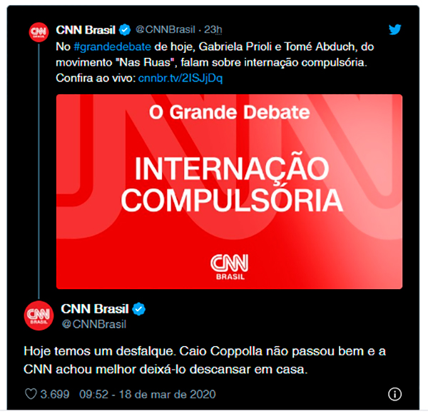 Menos de 24 horas depois de ter entrado em funcionamento online, a emissora CNN Brasil entrou em pânico com a possibilidade de contaminação de todos os seus profissionais em comunicação depois de ser divulgado que o presidente do Senado, Davi Alcolumbre, testou positivo para o Novo Coronavírus. Alcolumbre participou da festa de inauguração da CNN Brasil que reuniu 1300 convidados, acompanhado do presidente da Câmara Rodrigo Maia.