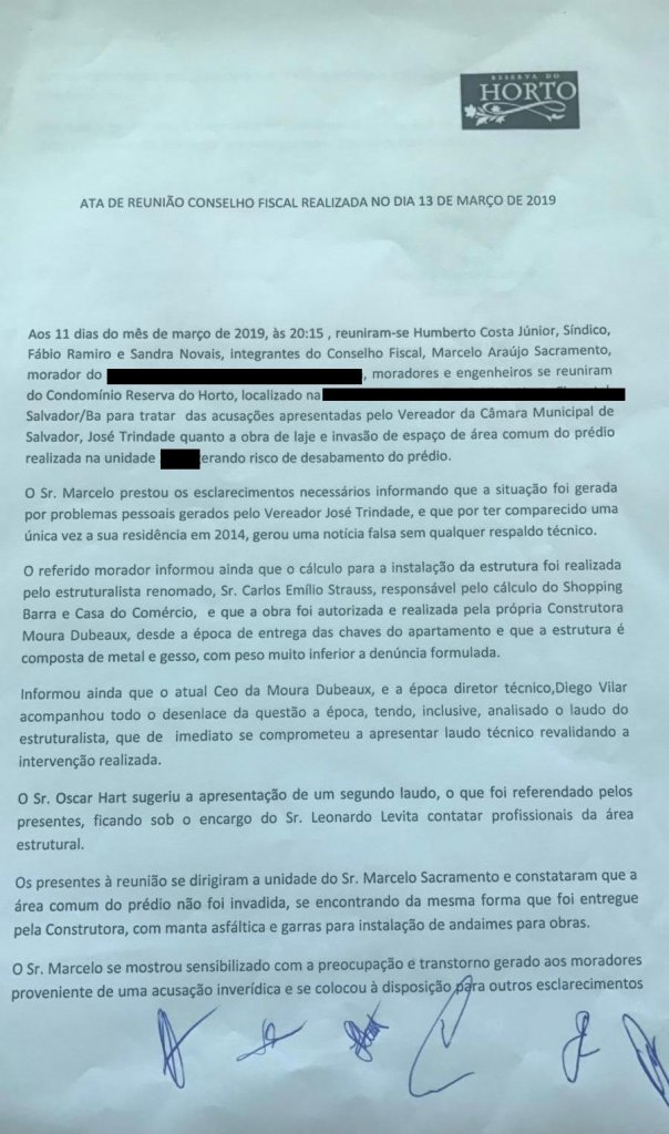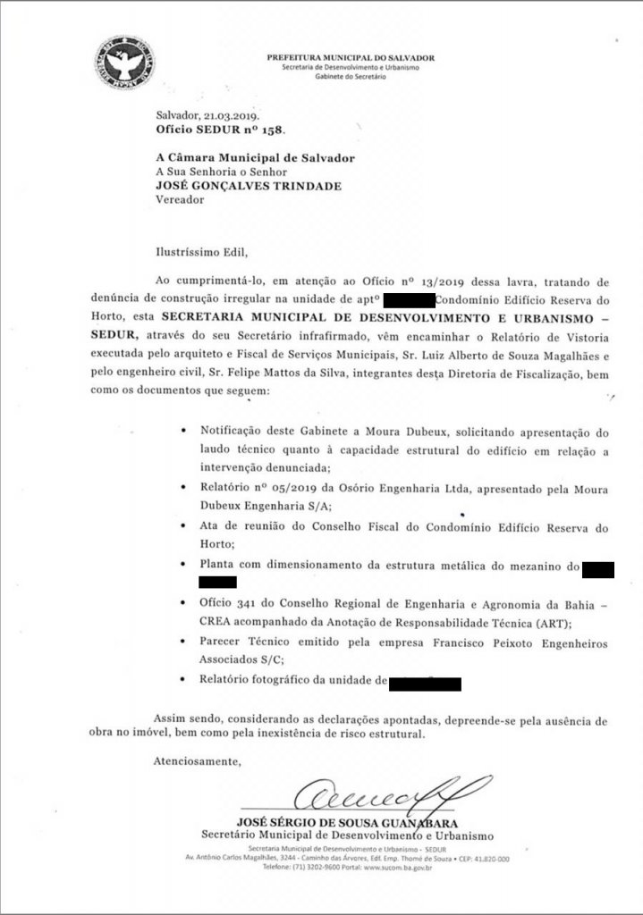 Segundo mostram os laudos da Secretaria de Desenvolvimento Urbano do Município não existe nenhuma obra no imóvel, nem existiu depois da entrega do apartamento em 2013. O apartamento foi vistoriado pelo CREA em 14/03/19 que atesta não encontrar qualquer vestígio de obra no local ( declaração assinada pelo presidente do órgão 01) e pela SEDUR que atesta também a inexistência de qualquer obra ou irregularidade ( documento assinado pelo Secretario 02 ) .