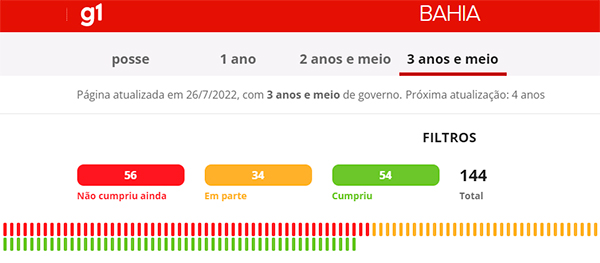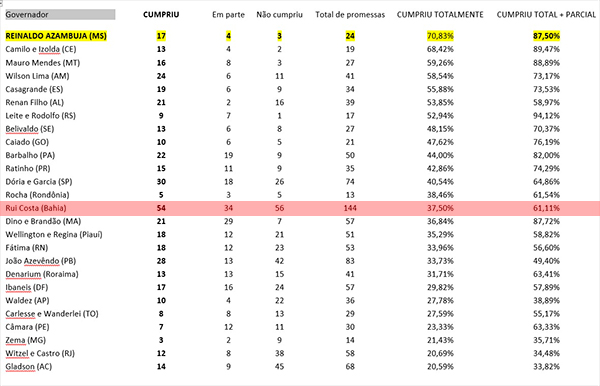 Na Bahia, Rui Costa ocupa o 14º lugar da tabela com 61,11% das propostas realizadas. O governador petista prometeu 144 ações, não cumpriu 56, fez “em parte” 34 e entregou 54. Ou seja, POUCO E NADA foi realizado “na sua totalidade”