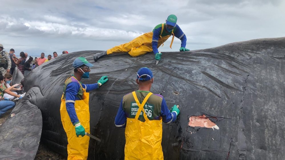 Desde cedo, 22 agentes da nossa equipe de operações especiais da Limpurb estão numa força-tarefa para a retirada da carcaça de baleia-jubarte que está encalhada na praia de Coutos, numa ação em conjunto com o Instituto Baleia Jubarte.