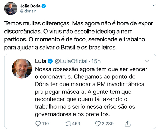 O governador de São Paulo, João Dória, virou o assunto mais comentado no twitter depois de trocar “elogios” com o ex-presidente Lula. O tucano respondeu uma postagem do afirmando que o coronavírus “não escolhe ideologias nem partidos” e que “é hora de deixar as diferenças de lado”.