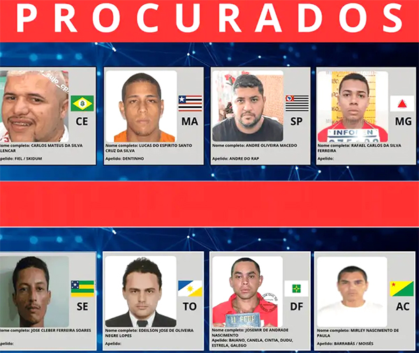 O Ministério da Justiça e Segurança Pública (MJSP) lançou nesta segunda-feira (8) o site gov.br/captura, que disponibiliza a lista dos 216 foragidos mais procurados do país. Cada unidade da Federação indicou oito alvos prioritários com base em uma matriz de risco, que avaliou aspectos como gravidade e natureza do crime cometido, vinculação com organizações criminosas, existência de múltiplos mandados de prisão e atuação interestadual.