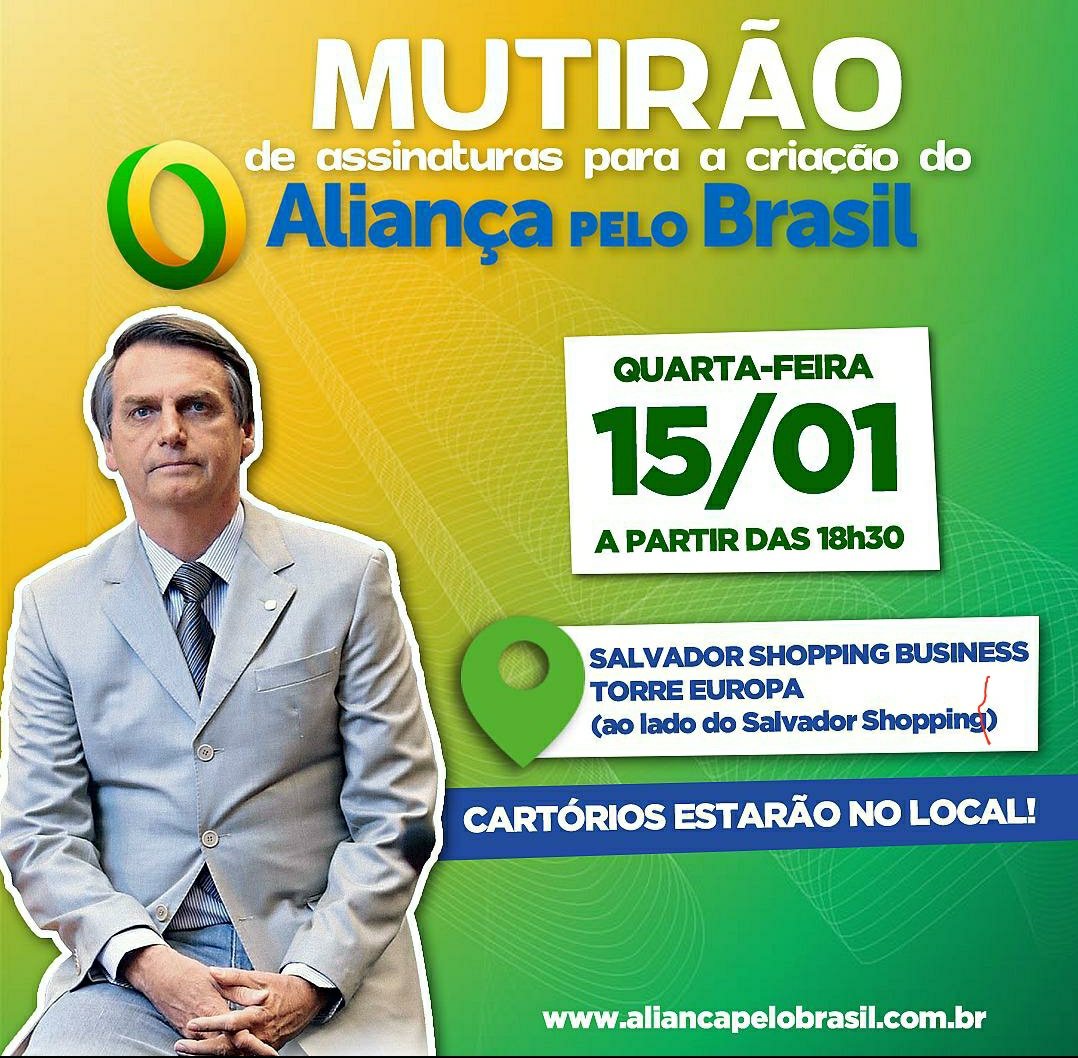 Eleitores de Bolsonaro tem mais um ponto para a criação do primeiro partido conservador cristão do país. Nesta quarta-feira (15), a partir das 18h30, no Salvador Shopping Business (Torre Europa), será realizado um “Mutirão de Assinaturas para a Criação do Aliança pelo Brasil”. Diversos cartórios estarão disponíveis para viabilizarem reconhecimento de firma dos interessados em ajudar a constituição do partido do presidente Jair Bolsonaro.