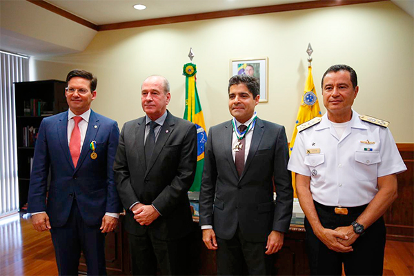Na tarde desta quarta-feira (26), em Brasília, o presidente nacional do Democratas e prefeito de Salvador, ACM Neto, foi condecorado com a Medalha Ordem do Mérito da Defesa. O ministro Fernando Azevedo e Silva (Defesa) foi o responsável pela entrega da homenagem. ACM Neto recebeu a insígnia do grau Comendador, condecoração feita pelo reconhecimento dos relevantes serviços prestados pelo prefeito ao Ministério da Defesa e às Forças Armadas. Durante manifestação aos presentes, o ministro enalteceu o respeito demonstrado por ACM Neto às “idiossincrasias, diferenças e atos” realizados pela Marinha, Exército e Aeronáutica.
