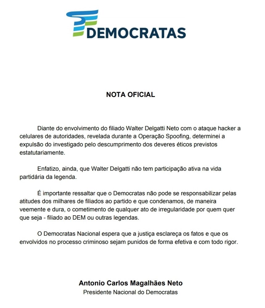 Em nota oficial, o presidente nacional do DEM anunciou a expulsão do criminoso Walter Delgatti Neto.