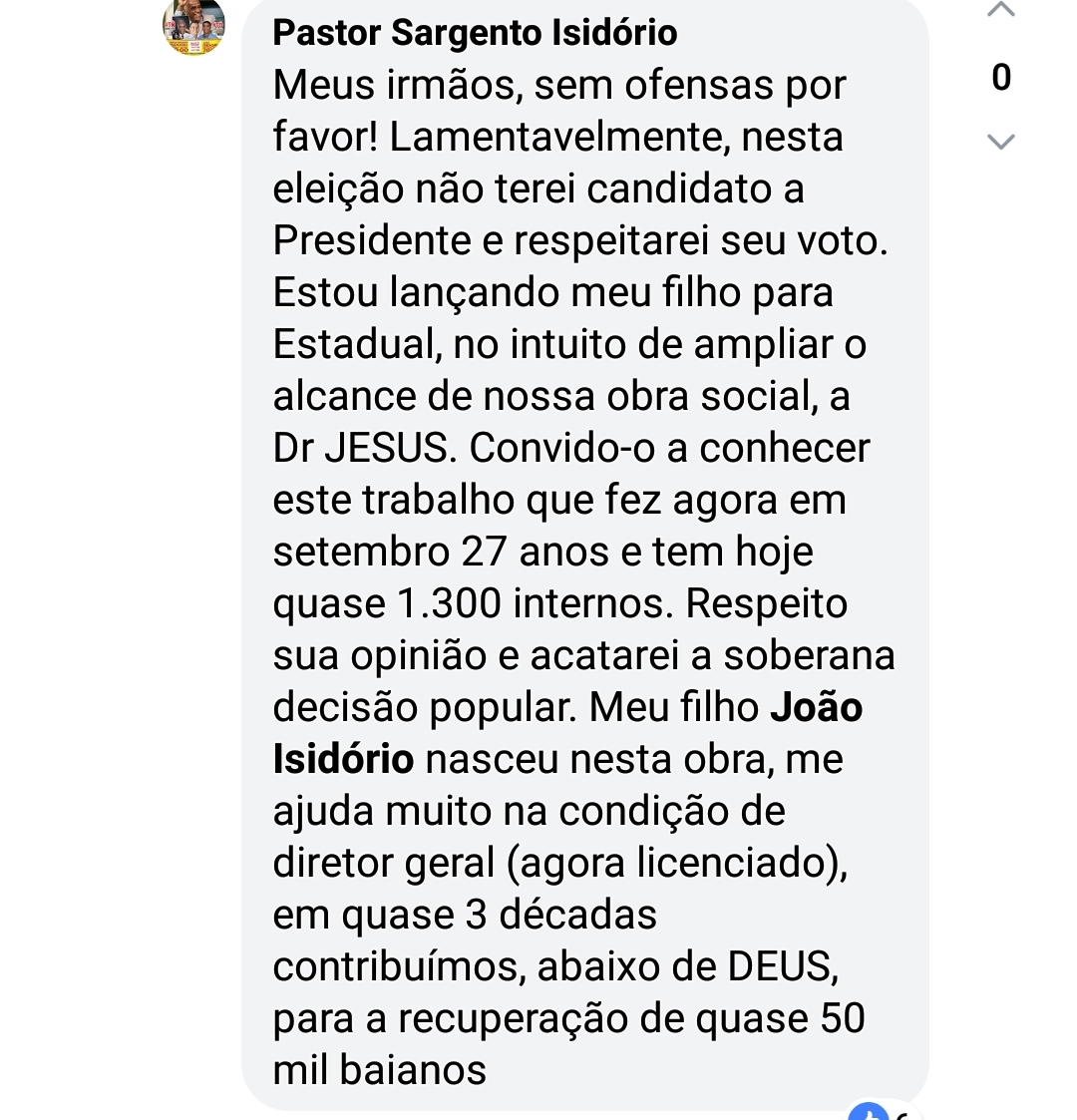 “Nesta eleição não terei candidato a presidente e respeitarei seu voto”, justificou o Parlamentar via redes sociais. O doido não curte Haddad.