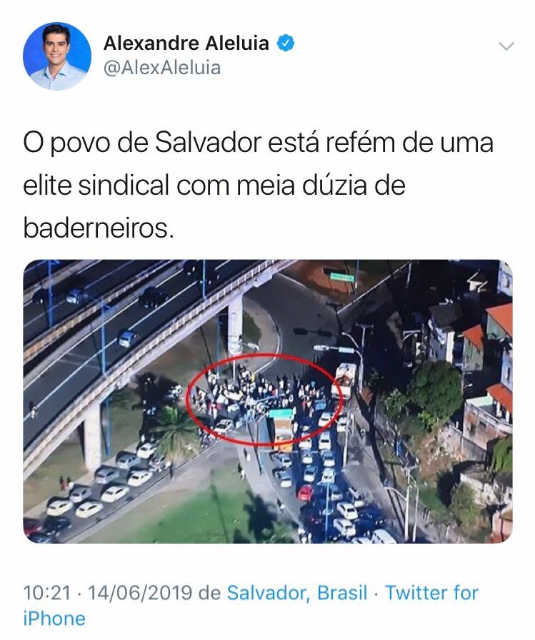 O vereador Alexandre Aleluia (DEM) utilizou as redes sociais na manhã desta sexta-feira (15) para criticar o primeiro ato da Greve Geral organizado por entidades sindicais na capital baiana. “O povo de Salvador está refém de uma elite sindical com meia dúzia de baderneiros”, escreveu o legislador, ao publicar uma foto com uma pequena quantidade de manifestantes que travaram o trânsito em uma das principais vias da cidade.