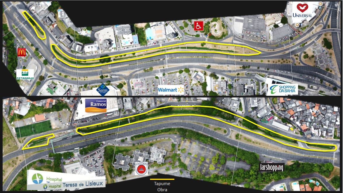 Pontos de ônibus – Em função do isolamento por tapume de toda essa área em obras, o ponto de ônibus localizado na Avenida ACM em frente à Igreja Mundial do Poder de Deus será deslocado para perto da faixa de pedestre e da sinaleira que ficam 350 metros mais adiante, no sentido Comercial Ramos. Quem atualmente pega o ônibus neste local terá como opção o novo ponto mais à frente ou aquele situado nas imediações da IURD, que não sofrerá modificação.