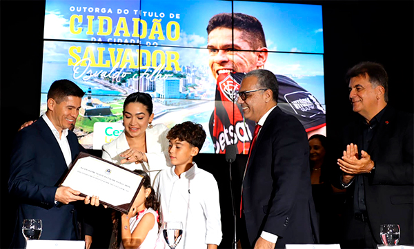 Em uma cerimônia marcada por emoção e reconhecimento, o atacante Osvaldo, um dos principais nomes do Esporte Clube Vitória, recebeu na noite desta segunda-feira (27) o Título de Cidadão Soteropolitano. O evento realizado no Centro Cultural da Câmara Municipal de Salvador, reuniu familiares, autoridades e figuras importantes do clube para homenagear a trajetória e a identificação do jogador com a capital baiana.
