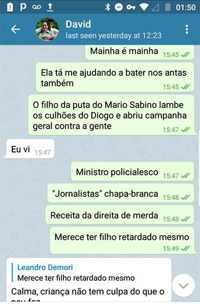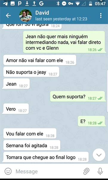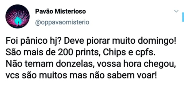 Em mais uma aparição no Twitter, o perfil “Pavão Misterioso” ( twitter.com/oppavaomisterio ), divulga “prints” de chats do aplicativo Telegram. A supostas interações envolveriam os deputados Marcelo Freixo, Jean Wyllys, Paulo Pimenta e David Miranda além do seu esposo e dono do site Intercept Brasil, Glenn Greenwald e o editor-chefe do portal, Leandro Demori.