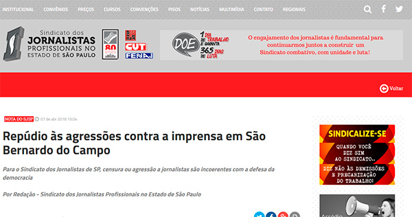 Debaixo da bandeira vermelha da Central Única dos Trabalhadores, o Sindicato dos Jornalistas de São Paulo mostrou estar longe dos filiados e perto do criminoso condenado Lula do Partido dos Trabalhadores. Nas entrelinhas do comunicado oficial, o Sindicato deu o seu recado: jornalista só poderá trabalhar em paz “com Lula livre”.