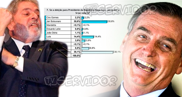 Bolsonaro tem 34,8% das intenções de voto contra 21% do ex-presidiário petista, Lula da Silva.