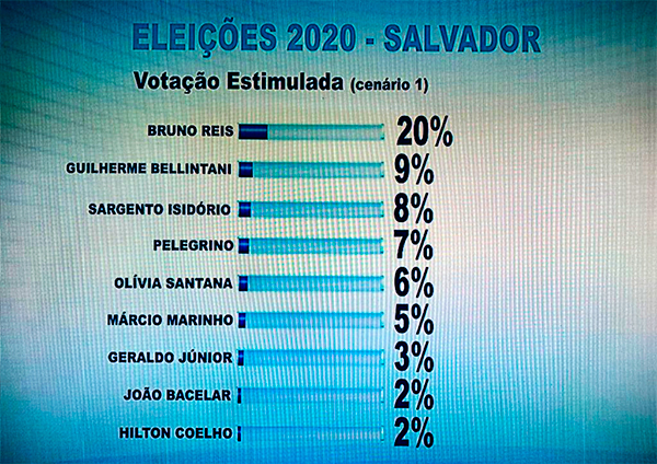 Segundo pesquisa realizada pela TV Record Bahia, se a eleição fosse hoje, o prefeito de Salvador seria Bruno Ries, do Democratas. O cenário “estimulado” coloca Bruno com mais do que o dobro de intenções de voto do segundo colocado, o atual presidente do Esporte Clube Bahia, Guilherme Bellintani.