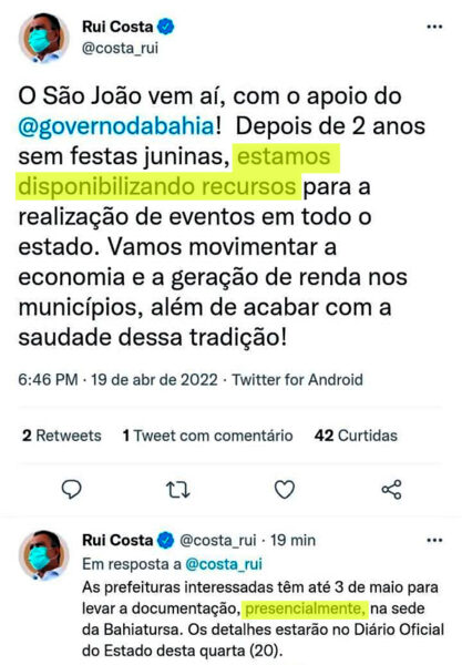 Em redes sociais, o governador Rui Costa anunciou que irão jorrar grana a torto e direito para aquelas prefeituras que desejem realizar festejos juninos. O edital de apoio para os municípios está direcionado às “prefeituras interessadas até o dia 3 de maio (…) presencialmente”.
