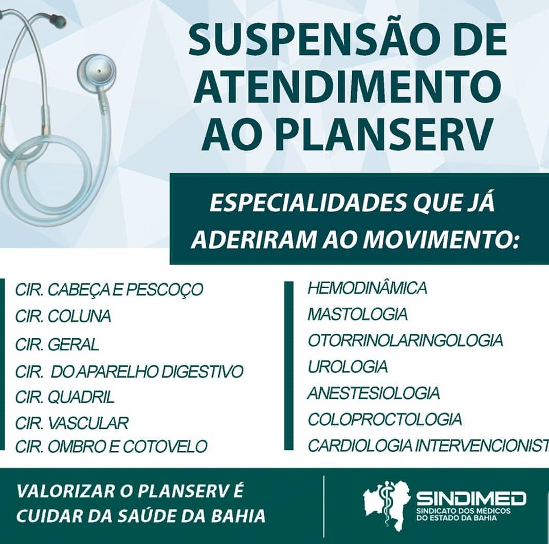 Nesta quarta-feira (13) às 19hs, o Sindimed organiza assembleia com profissionais da saúde na sua sede no bairro de Ondina. Assista. Segundo o próprio sindicato cirurgias e diversos atendimentos foram suspensos para filiados do Planserv.
