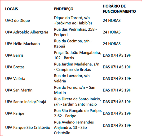 Lista das unidades com serviços de urgência odontológica em Salvador: