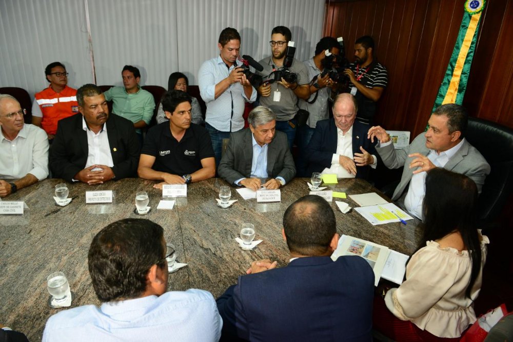 Os secretários Luiz Carreira (Casa Civil), e André Fraga (Sustentabilidade), o presidente da Limpurb, Marcus Passos, e o diretor da Defesa Civil, Sósthenes Macêdo, participaram na tarde desta quinta-feira de uma reunião com o governador Rui Costa para discutir estratégias de combate ao vazamento de óleo que atinge algumas praias de Salvador desde a semana passada. Prefeitos de cidades atingidas pelo desastre ambiental também compareceram ao encontro, realizado na governadoria.