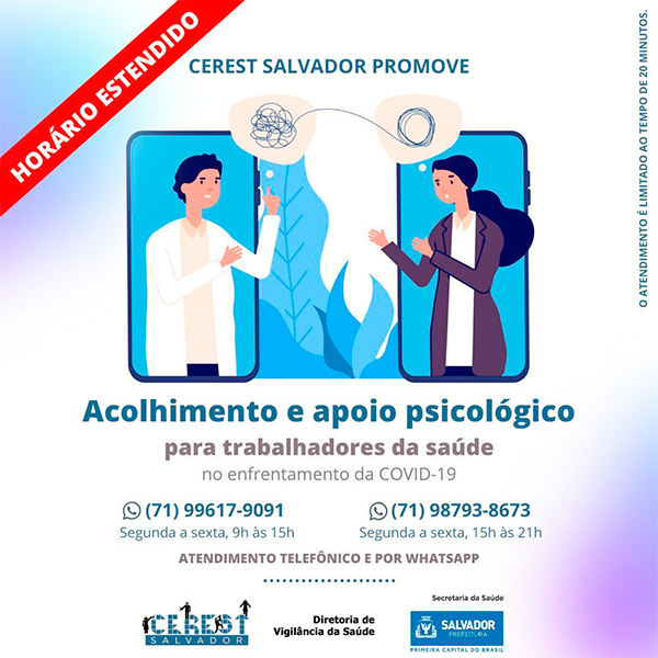 A Prefeitura de Salvador, através do Centro de Referência em Saúde do Trabalhador (CEREST), órgão ligado à Secretaria Municipal da Saúde, estendeu por mais três horas o horário de acolhimento e apoio psicológico online para ajudar os trabalhadores das redes públicas e privada que estão atuando na linha de frente do combate ao coronavírus na capital baiana. O apoio tem objetivo de ajudar a conter ansiedade e o medo agravado com a pandemia. O serviço gratuito já está ativo e funciona de segunda a sexta-feira através de dois contatos telefônicos: (71) 99617-9091, das 09h às 15h, ou no (71) 98793-8673, das 15h às 21h. Cada atendimento é limitado ao tempo de 20 minutos.