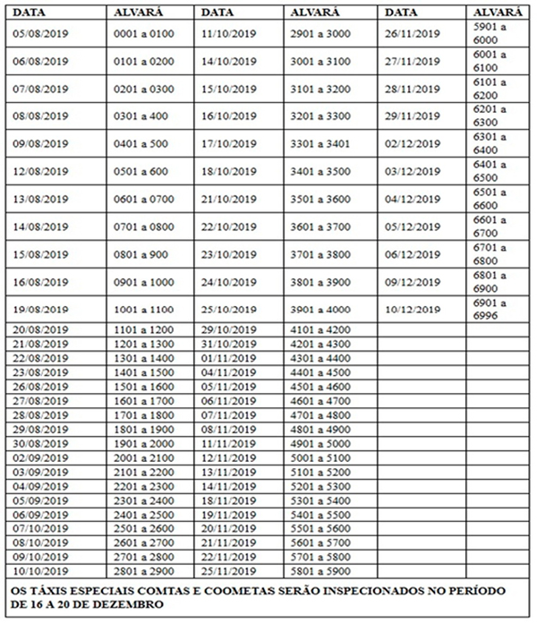 O valor da inspeção é de R$ 81,79, e aquele que não se apresentar na data marcada pagará multa de R$ 32,95. O cumprimento da medida vai até dezembro, seguindo o fluxo do cronograma montado segundo o número do alvará de cada veículo. A expectativa é que sejam vistoriados, por dia, uma média de 100 veículos. O serviço está disponível de segunda à sexta-feira, das 7h30 às 11h30 e das 13h às 16h30.