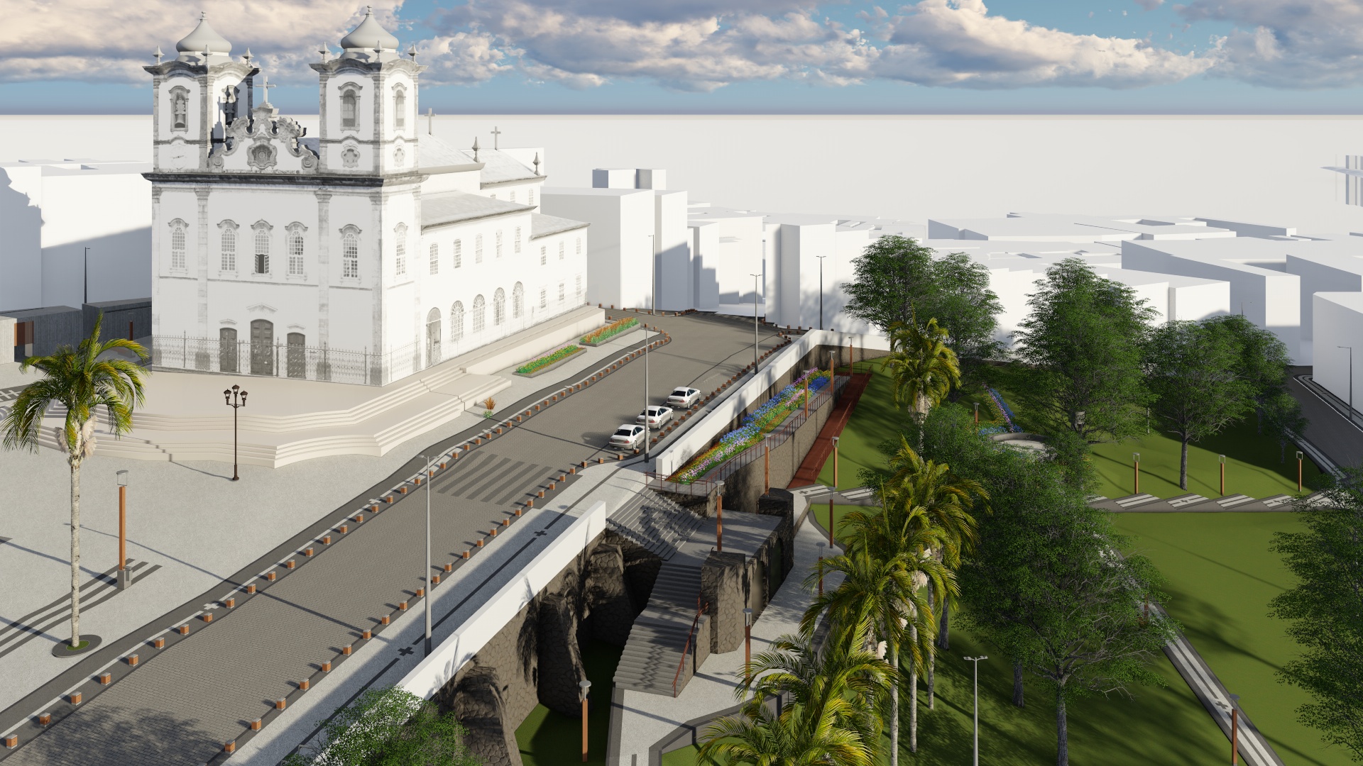 Para potencializar o caráter simbólico da igreja sobre seu entorno, a requalificação da praça irá reforçar o eixo Largo/Catedral. Serão ampliados os limites da Praça do Largo, de maneira que esta seja uma continuidade das escadarias da basílica, criando-se uma continuidade que sugere a importância da edificação sobre as demais e unificando-se o conjunto arquitetônico. Toda a pavimentação da praça será executada em mosaico de pedra portuguesa branca, com grafismos marcados no piso.