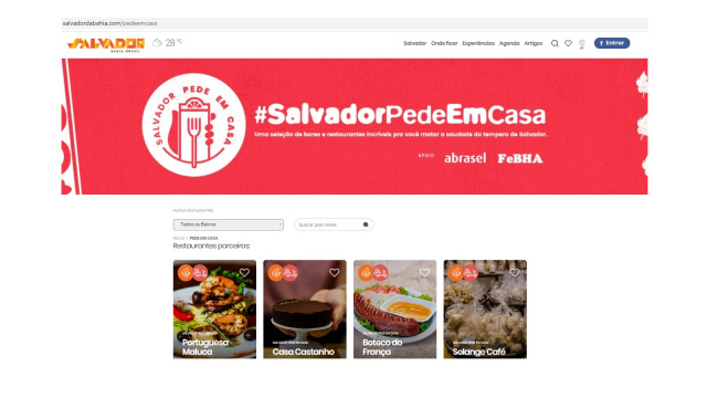 Para fortalecer o comércio local diante da crise mundial causada pela Covid-19, a Prefeitura, através da Secretaria Municipal de Cultura e Turismo (Secult), lança a campanha Salvador Pede em Casa. A iniciativa visa apoiar, aproximadamente, 100 bares e restaurantes situados nas zonas turísticas e cadastrados no site de promoção turística da cidade – o salvadordabahia. com . A ação vai divulgar e incentivar o consumo através da modalidade de delivery (entrega em casa) e de retirada no próprio estabelecimento. Uma página especial no site reúne informações dos estabelecimentos, como os pratos ofertados, fotos, horário de funcionamento, tipos de entrega, telefones e mais informações que auxilie o cidadão na escolha.