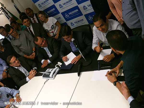 O presidente da Câmara de Salvador, vereador Geraldo Junior (SD) participou da posse dos novos secretários da prefeitura da capital baiana, na manhã desta terça-feira (5). O prefeito ACM Neto (DEM) anunciou cinco novas movimentações para o ano de 20149. Dentre elas, dois vereadores vão comandar as pastas. Geraldo Junior desejou sorte aos vereadores empossados secretários e mandou uma mensagem de apoio. “Desejo foco, determinação, força de vontade, perseverança. Tem que acreditar no projeto político, na força da responsabilidade que é gerir uma pasta. Tem a lei de responsabilidade fiscal. Temos que prestar contas aos órgãos de controle fiscal e conheça os reclames da cidade”, asseverou.