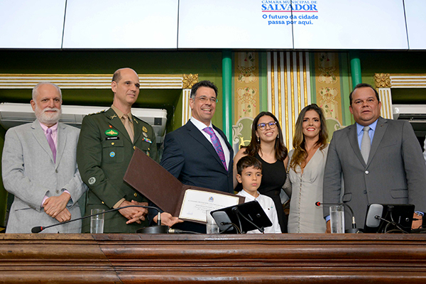 A mais alta comenda da Câmara Municipal de Salvador, a Medalha Thomé de Souza, foi entregue na noite desta segunda-feira (30) ao procurador-chefe da União no Estado da Bahia, Reinaldo de Souza Couto Filho. A homenagem foi proposta pelo presidente da Casa, vereador Geraldo Júnior (SD), que presidiu a sessão solene no Plenário Cosme de Farias. “Preciso tomar um curso com Reinaldo para fazer tantas atividades. Seu currículo é quase um livro. Professor universitário, mestre, escritor e procurador chefe da União na Bahia. Hoje, além de nossa Casa, a advocacia pública está em festa por essa justa homenagem”, afirmou Geraldo Júnior. O vereador Carlos Muniz (Podemos) também prestigiou a sessão.