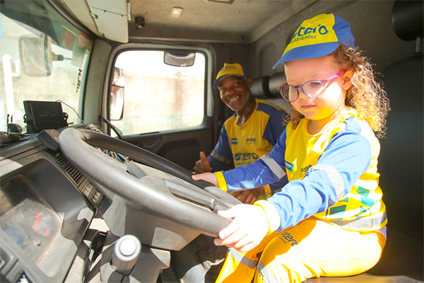 Já com o fardamento, Milena agradeceu pelo presente e reforçou a importância do trabalho realizado pelos amiguinhos da Limpurb. “Meus amiguinhos deixam a rua limpa, isso é muito bom para todo mundo. Eu gosto muito deles”, declara.