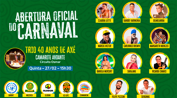 A Prefeitura de Salvador anunciou a abertura oficial do Carnaval 2025 com um desfile especial no Circuito Osmar, no Campo Grande. A festa, que celebra os 40 anos da axé music, contará com um trio exclusivo, o “Camarote Andante”, reunindo grandes nomes como Carlinhos Brown, Margareth Menezes, Daniela Mercury, Claudia Leitte, Xanddy Harmonia, Felipe Pezzoni, Sarajane, Ricardo Chaves, Gilmelândia, Márcio Victor e Serginho.