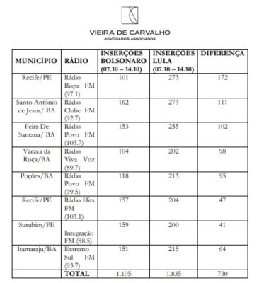 Segundo o relatório da empresa Audiency Brasil Tecnologia Ltda, oito rádios de municípios da Bahia e de Pernambuco, que deixaram de veicular 730 inserções da campanha de Bolsonaro — beneficiando indiretamente Lula. Na petição, a equipe de campanha do presidente Bolsonaro afirma que a irregularidade noticiada é gravíssima e “pôde-se comprovar, em pequena amostragem de oito rádios (nominalmente referidas), em apenas uma semana, significativa discrepância de 730 inserções, em desfavor da campanha do candidato peticionário”.