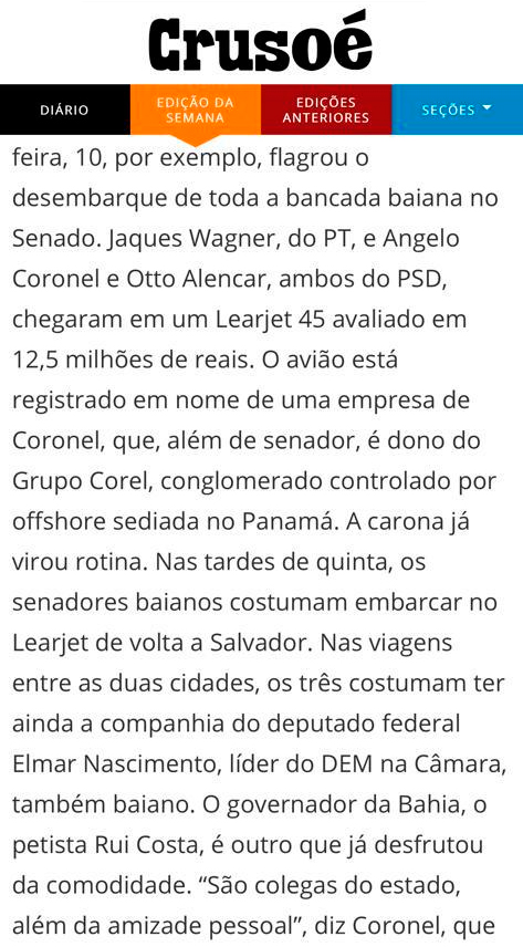 A jornalista Renato Alves afirmou, em publicação na revista Crusoé (clique aqui), que o senador Ângelo Coronel utiliza cota parlamentar para abastecer seu jatinho. “O combustível do jatinho do senador é você, leitor, quem ajuda a pagar. Só em setembro, Coronel usou 14,6 mil reais da cota parlamentar para abastecer o tanque da aeronave”.