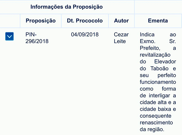 Por meio do Projeto de Indicação nº 296/18, o vereador Cezar Leite sugeriu ao Executivo Municipal a revitalização e a reativação do Elevador do Taboão, desativado desde 1961. A Indicação foi atendida pelo prefeito ACM Neto que disponibilizou um investimento de quase R$ 4 milhões para reativar este importante equipamento.