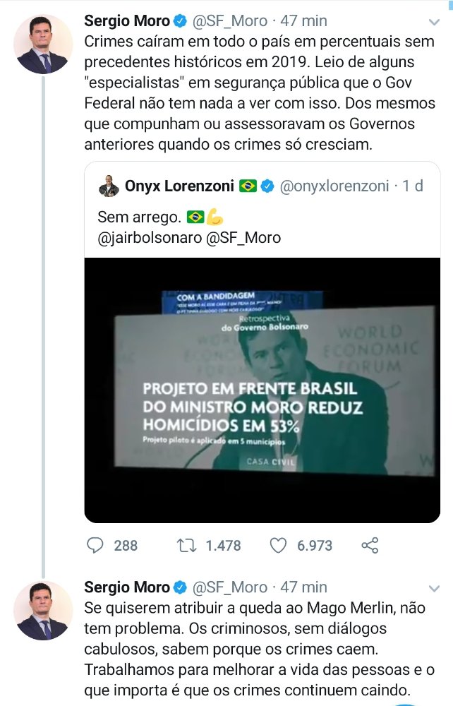 Em sua conta pessoal em Twitter, o ministro Sérgio Moro fez questão de apontar, de forma direta e objetiva, que o sucesso no combate à criminalidade é uma realidade no Brasil do presidente Jair Messias Bolsonaro.