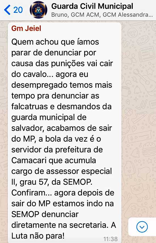 Expulso da corporação por ter cometidos “infrações disciplinares constantes” (veja o print acima), Jeiel Webster relata que mesmo exonerado e “desempregado temos mais tempo para denunciar as falcatruas (sic) e desmandos da Guarda Municipal de Salvador, acabamos de sair do MP (Ministério Público), a bola da vez é o servidor da prefeitura que acumula cargo de assessor especial, grau 57, da SEMOP” (confira no print abaixo).