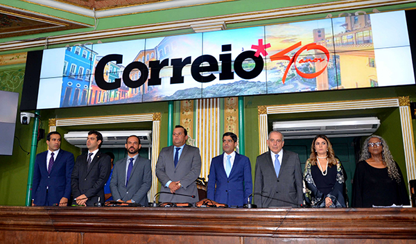 Liberdade para ousar – Em nome da equipe que produz o Correio falou a jornalista Linda Bezerra, editora-chefe do jornal. Ela agradeceu à direção da Rede Bahia por “nos dar liberdade para ousar”. E destacou a importância do jornal se assumir como um veículo regional, voltado para a comunidade local. “Nenhum jornal sobrevive sem credibilidade”, declarou, frisando a importância cada vez maior, em tempos de “fake news”, de ser responsável com a veracidade das informações recebidas e divulgadas. Completaram a mesa da sessão, ainda, o deputado estadual Tiago Correia (PSDB), que representou a Assembleia Legislativa da Bahia, o vice-prefeito Bruno Reis e a diretora do Correio, Renata Magalhães Correia. Prestigiaram o evento os vereadores Paulo Magalhães (PV), líder da bancada do prefeito na Casa, Kiki Bispo (PTB), Pedro Godinho (MDB), Demétrio de Oliveira (DEM), Sérgio Nogueira (PSDB) e Alex Mine (DEM). O cantor e compositor Del Feliz cantou o Hino Nacional na abertura da sessão.