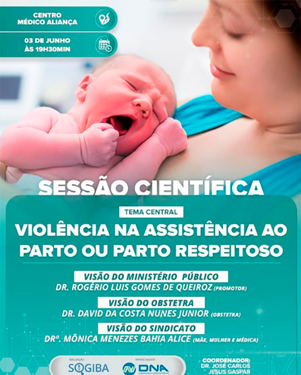 A Associação de Obstetrícia e Ginecologia da Bahia (SOGIBA) vai realizar no dia 3 de junho, às 19h30, no Centro Médico Aliança, sua terceira sessão científica do ano, com o tema central a “Violência na Assistência ao Parto ou Parto Respeitoso”. A sessão, coordenada pelo Diretor da Comissão de Ética e Defesa Profissional da Sogiba, Dr. José Gaspar, vai trazer as visões sobre o tema do promotor público, Dr. Rogério Queiroz, do obstetra, Dr. David Nunes, e a visão do sindicato pela obstetra, Dra. Monica Bahia.