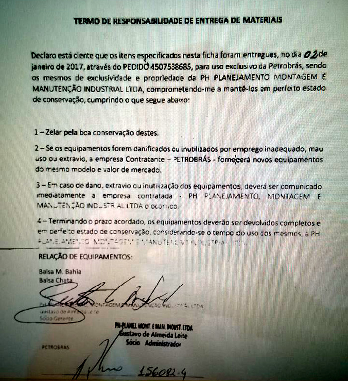 Em janeiro deste ano, a maior empresa petrolífera do país, Petrobras, contratou duas balsas da empresa PH Planejamento e Manutenção Industrial Ltda. No contrato, a Petrobras se compromete a zelar pela boa conservação das balsas assim como de fornecer novos equipamentos caso estes “forem danificados ou inutilizados por emprego inadequado, mau uso ou extravio”.