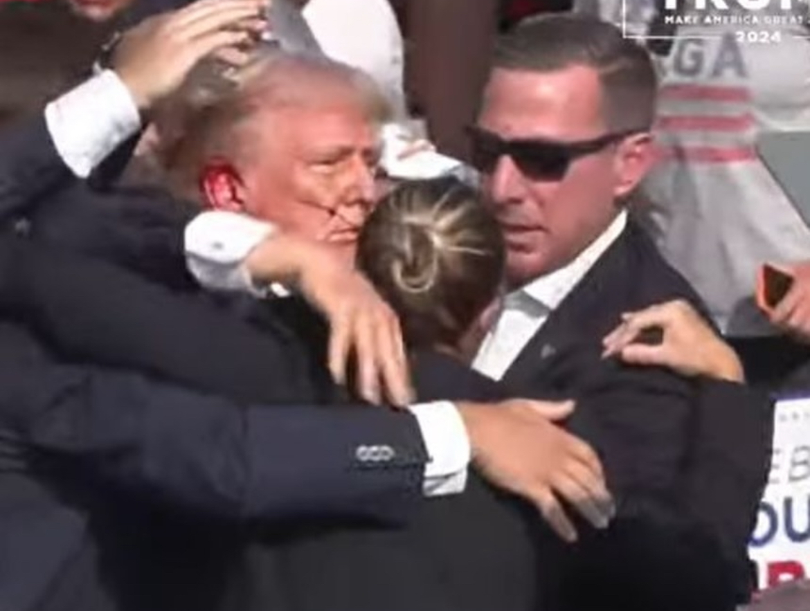 Agentes o ajudaram a se levantar e ele foi visto com sangue no rosto, enquanto gritava de volta para a multidão e erguia o punho. Em seguida, ele foi levado a um veículo e retirado do local.