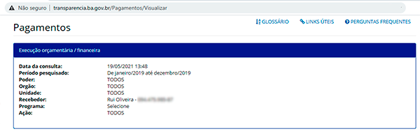 Segundo o Portal da Transparência, o professor e sindicalista Rui Oliveira recebeu, um ano antes da pandemia, “jetons” no valor de R$ 10.313,00 via Conselho Estadual de Educação. O que chama atenção no descritivo é o valor de R$ 2.250,00 por “manutenção de Serviços Técnico e Administrativo” na Secretaria de Desenvolvimento Rural.
