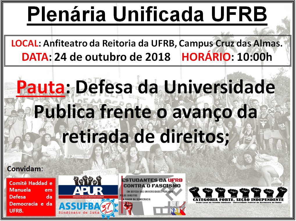 A Plenária Unificada UFRB, ocorreu no dia 24 de outubro de 2018, às 10h, no campus de Cruz das Almas. No evento foram estendidas bandeiras partidárias, distribuição de panfleto e santinho com o número do candidato a presidente do PT.
